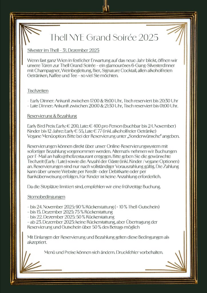 Wenn das alte Jahr in seinen letzten Takten klingt, feiern wir im Thell den Beginn des neuen – mit einem Menü, das glitzert, funkelt und schmeckt wie Mitternacht in Wien. Prosit 2026!